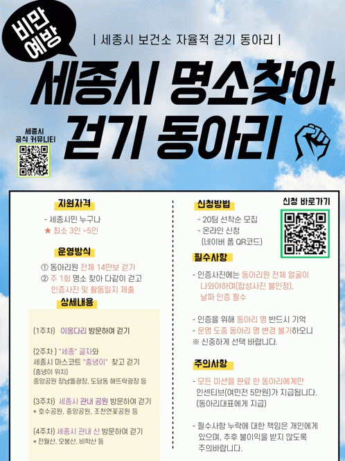 세종시보건소 17일부터‘자율적 걷기 동아리’ 20팀 선착순 모집