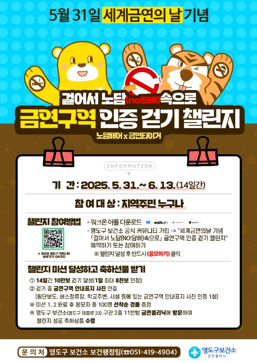 [시사토픽뉴스]영도구 보건소는 제38회 세계 금연의 날(5월 31일)을 맞아 지역 내 금연 실천 분위기를 조성하고, 주민들의 건강한 생활 환경을 마련하고자 5월 31일부터 6월 13일까지 14일간 ‘걸어서 노담(No! 담배) 속으로’ 금연구역 인증 걷기 챌린지를 운영한다.