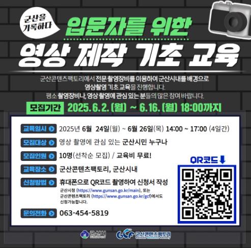 참여 신청은 6월 2일에서 16일까지 군산시청 또는 군산콘텐츠팩토리 누리집을 통해 QR 부호(코드)로 접수하면 되며, 교육 참가 인원은 10명으로 선착순 모집한다.