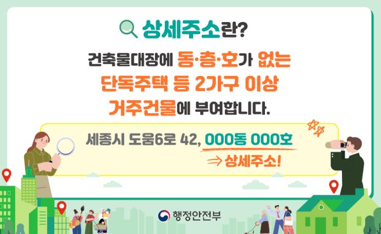 상세주소란 도로명주소의 건물번호 뒤에 표시되는 정보이다. 건축물대장상 동·층·호가 없는 원룸 및 다가구주택 등이 대상으로 소유자·임차인의 신청으로 부여된다.