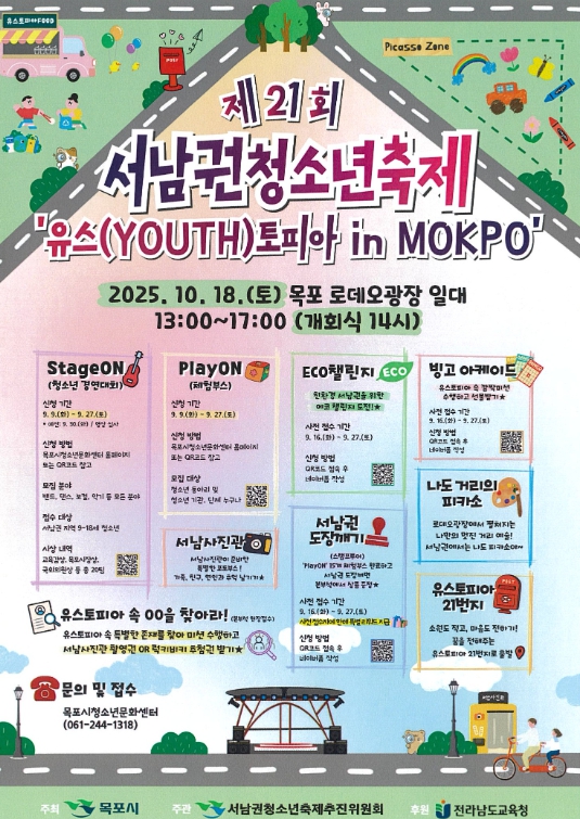 [시사토픽뉴스]제21회 서남권청소년축제가 ‘유스(YOUTH)토피아 in MOKPO’를 주제로 오는 10월 18일(토) 오후 1시부터 5시까지 목포 로데오광장 일대에서 열린다.