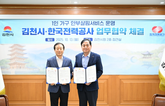 [시사토픽뉴스] 김천시는 지난 13일 한국전력공사 대구본부 김천지사(지사장 박용성)와 함께 ‘1인 가구 안부살핌서비스 '든든e살핌'’ 업무협약을 체결했다.