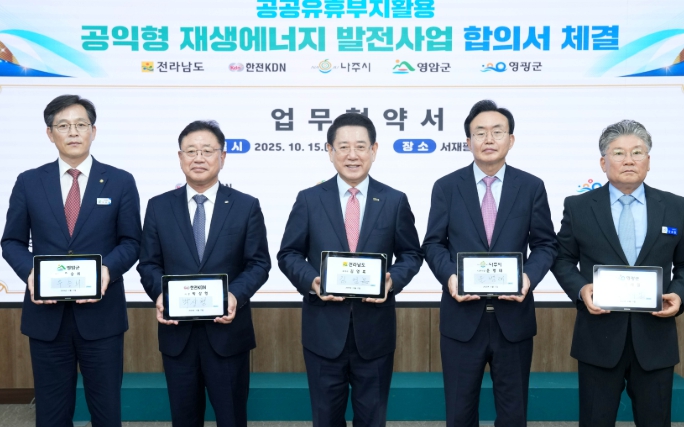 [시사토픽뉴스]전라남도는 15일 새정부의 재생에너지 대전환 기조와 재생에너지 보급 확대 정책에 따라 나주시, 영광군, 영암군, 한전KDN과 탄소중립 실현·에너지 기본소득 실현을 위한 ‘공익형 재생에너지 발전사업’ 업무협약을 했다고 밝혔다.