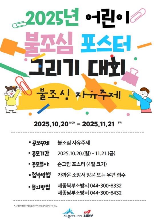 [시사토픽뉴스]세종소방본부가 20일부터 내달 21일까지 ‘2025년 어린이 불조심 포스터 그리기 공모전’을 개최한다.