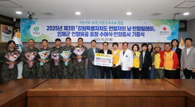 [시사토픽뉴스]인제군은 ‘2025 헌혈자의 날’을 기념해 지난 10월 20일 인제군청 소회의실에서 헌혈유공자 12명에게 인제군수 표창을 수여하고, 헌혈증서 1,000매를 강원혈액원에 기부했다고 밝혔다.