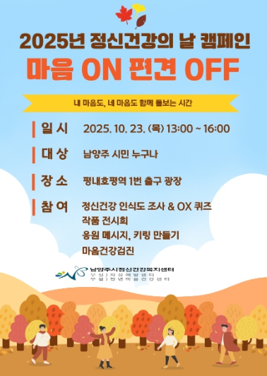 [시사토픽뉴스]남양주시는 오는 23일 오후 1시 평내호평역 1번 출구 광장 일원에서 ‘정신건강의 날’을 기념해 정신건강 인식 개선 및 편견 해소를 위한 연합캠페인 ‘마음 ON, 편견 OFF’를 진행한다고 21일 밝혔다.