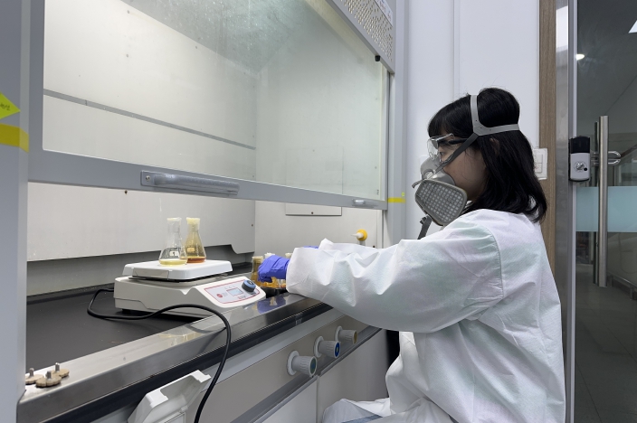 퇴비 부숙도 검사를 위해 분석시료를 훔후드에서 가열하여 분해하는 모습