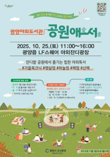 [시사토픽뉴스]광양시는 오는 10월 25일 광양읍 LF스퀘어 잔디밭공원에서 자연과 책이 어우러진 『광양 야외도서관–공원애愛서書』 행사를 연다고 밝혔다.