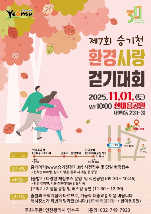 [시사토픽뉴스] 연수구는 오는 11월 1일 오전 10시 한마음공원(선학동 231-3) 및 승기천 일원에서 구민과 함께 자연 속에서 걷는 ‘제7회 승기천 환경사랑 걷기대회’를 개최한다.