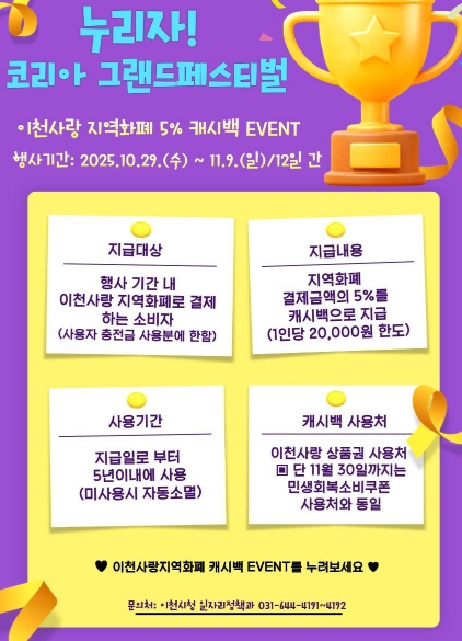[시사토픽뉴스]이천시는 행정안전부 주관 ‘2025 코리아그랜드페스티벌(KOREA GRAND FESTIVAL)’에 맞춰 지역화폐 이용을 촉진하고 지역 상권을 활성화하기 위한 ‘이천사랑 지역화폐 캐시백 5% 이벤트’를 추진한다고 밝혔다.