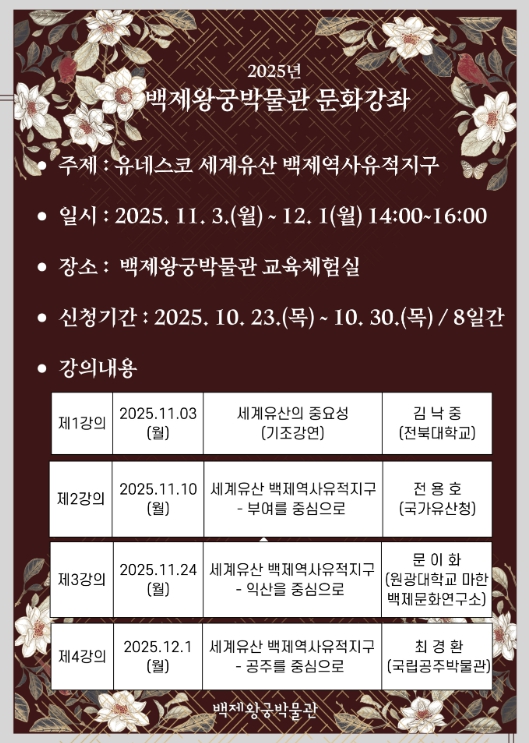 강좌는 △11월 3일 '세계유산의 중요성'(김낙중, 전북대학교) △11월 10일 '세계유산 백제역사유적지구-부여를 중심으로'(전용호, 국가유산청) △11월 24일 '세계유산 백제역사유적지구-익산을 중심으로'(문이화, 원광대학교 마한·백제문화연구소) △12월 1일 '세계유산 백제역사유적지구-공주를 중심으로'(최경환, 국립공주박물관)로 구성됐다.