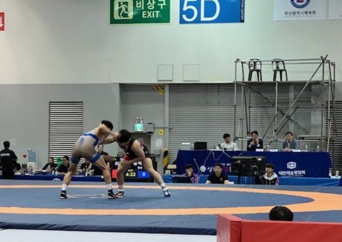 제106회 전국체육대회 레슬링 경기에서 정용석 선수(오른쪽)가 상대 선수와 치열한 경합을 벌이고 있다.