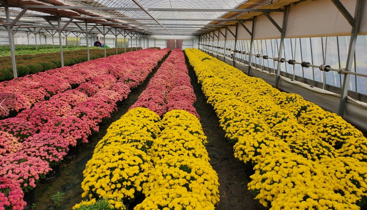 기술센터 내 재배된 국화 화분과 읍내 시가지에 전시중인 모습