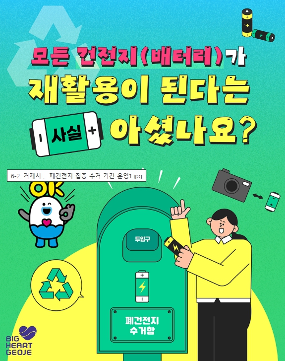 [시사토픽뉴스]최근 배터리로 인한 화재와 폭발 사고가 증가하고 있는 가운데, 거제시는 폐건전지를 안전하게 수거하고 폐건전지 수거율을 높이기 위해 오는 11월3일부터 11월 28일까지 한 달 동안 폐건전지 집중 수거 기간을 운영한다고 밝혔다.