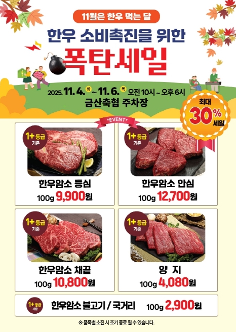 [시사토픽뉴스]한우 농가의 경영 안정을 위한 폭탄세일 행사가 11월 4일부터 11월 6일까지 금산축협 주차장에서 열린다.
