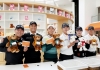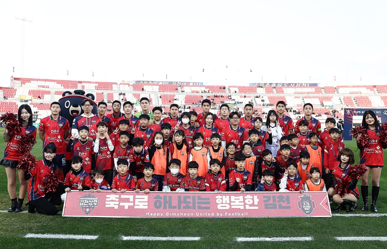 11월 1일 포항전 홈경기에서 김천상무 선수단과 에스코트 참가자가 사진을 찍고 있다.