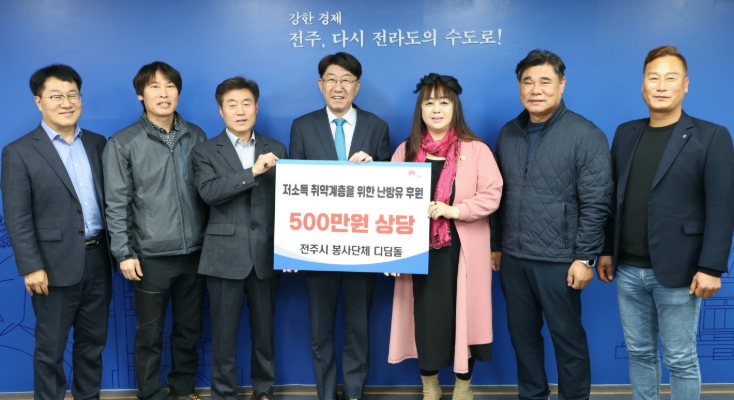 [시사토픽뉴스] 전주지역 봉사단체인 ‘디딤돌’(회장 박지윤)은 17일 전주시장실을 찾아 지역 저소득 취약계층 20세대에 전달할 예정인 500만 원 상당의 등유 쿠폰 사용권을 기탁했다.
