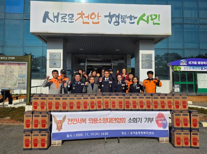 [시사토픽뉴스]천안서북소방서는 19일 14시, 의용소방대연합회와 성거읍 남·여의용소방대가 함께 성거읍행정복지센터에 소화기 50대를 전달했다고 밝혔다.