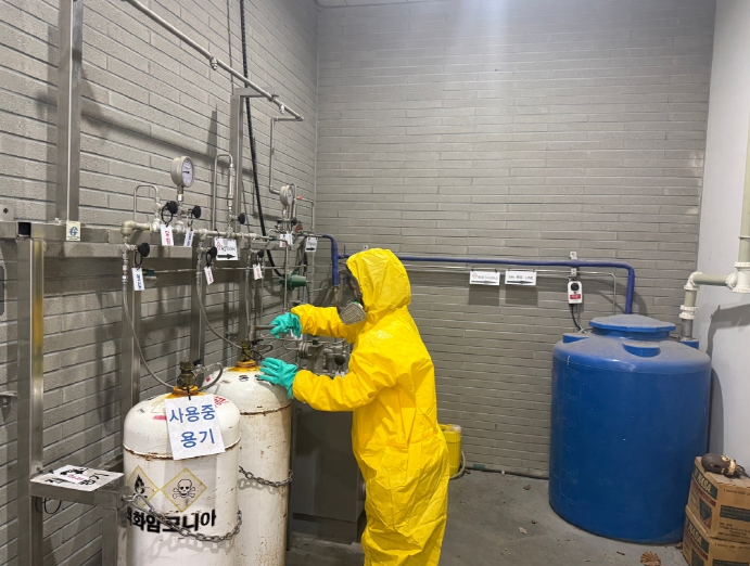 특히 방독마스크 착용 후 누출 밸브 차단, 살수장치 가동 등 현장 대응 과정까지 실제 상황과 유사하게 실시함으로써 직원들의 초기 대응능력과 시설 내 안전관리 체계를 점검하는 데 중점을 뒀다.