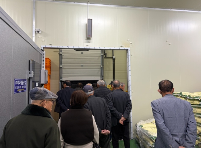 대한노인회 청양군지회 직원과 경로당 분회장들이 대치면 먹거리종합타운을 둘러보며, 무상급식 및 공공급식 사업 관련 현장을 점검하고 있는 모습