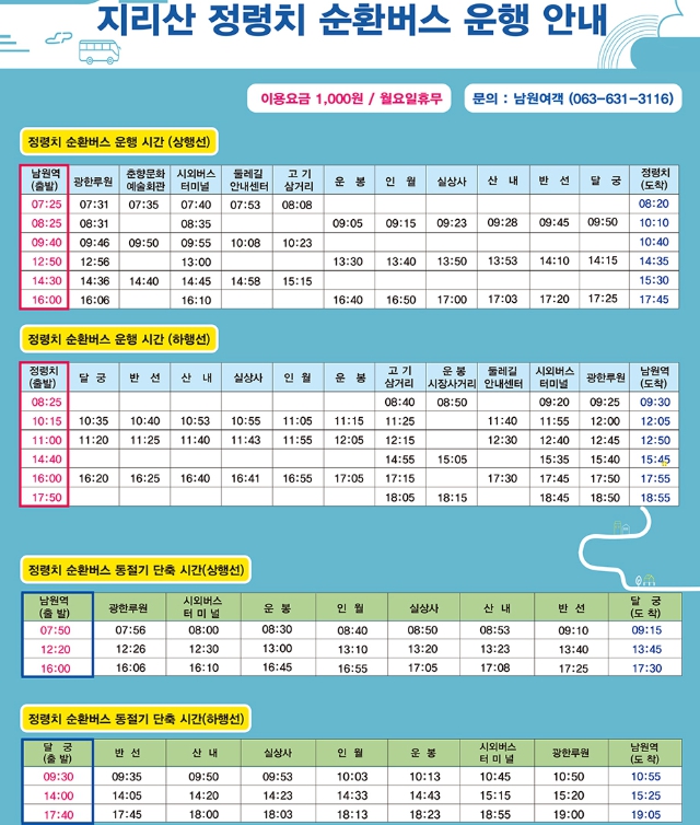 월요일은 휴무이며, 자세한 운행 시간표와 노선 정보는 남원시 홈페이지에서 확인할 수 있다.