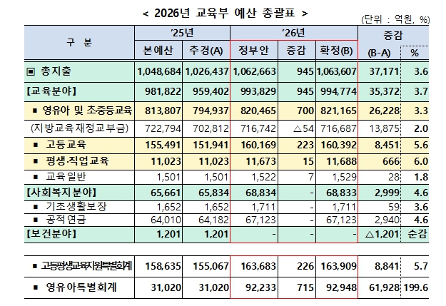 교육부 2026년도 예산 106조 3,607억 원 확정