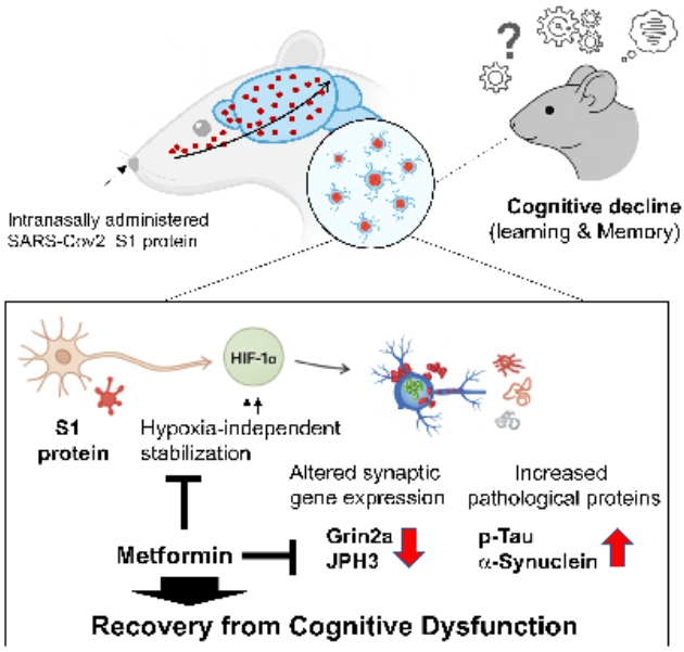 실험에서 쥐에게 S1 단백질을 비강으로 투여한 결과, 숨겨진 플랫폼을 찾는 시간이 길어지는 등 학습·기억 능력이 감소하고 낯선 공간에서 불안 행동이 증가하여 코로나19 감염 후 나타나는 인지저하와 유사한 양상이 관찰됐다. 또한, 투여 6주 후 뇌(해마)에서는 신경세포 수 감소와 함께 퇴행성 뇌질환에서 나타나는 병리 단백질 축적이 확인되어, 장기적인 뇌손상 가능성이 제기됐다.
