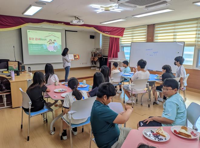 군내북초 학생들이 아침간편식을 먹으며 아침독서활동을 하고 있다.