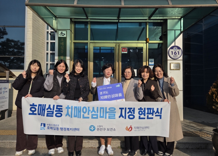 [시사토픽뉴스]수원시 권선구보건소 치매안심센터가 호매실동을 ‘치매안심마을’로 지정했다. 권선구보건소는 17일 호매실동 행정복지센터에서 ‘호매실동 치매안심마을 지정 현판식’을 열었다.