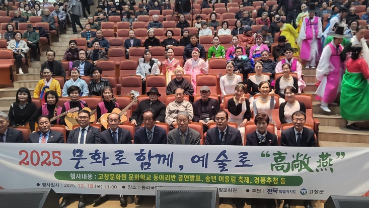 [시사토픽뉴스]고창문화원이 지난 18일 동리국악당에서 한 해를 마무리하는 송년 어울림 축제인 ‘2025 문화로 함께, 예술로 고창연(高敞燕)’ 행사를 성황리에 개최했다.