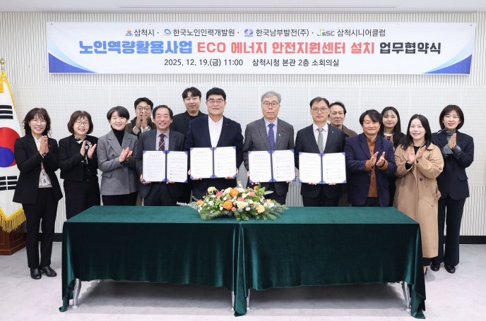 [시사토픽뉴스] 삼척시는 12월 19일 한국노인인력개발원, 한국남부발전(주) 삼척빛드림본부, 삼척시니어클럽과 함께 신규 어르신 일자리 창출사업으로 ‘Eco에너지 안전지원센터’ 운영을 위한 업무협약을 체결했다.