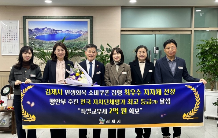 [시사토픽뉴스]김제시는 243개 전국 자치단체를 대상으로 하는 행정안전부의 「민생회복 소비쿠폰」 집행 평가에서 기초 시(市) 부문 최고등급인 가등급을 획득하며 특별교부세 2억원을 확보했다고 밝혔다.