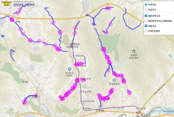 지역별로는 ▲김해시 27개 구간 165건, ▲진주시 8개 구간 35건, ▲합천군 13개 구간 18건 순으로 출동이 많았다. 이들 지역은 하천 인접 도로, 그늘진 곡선 구간, 교량 등 결빙 발생 가능성이 높은 대표적 위험지대로 분석된다.