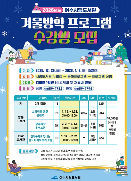 [시사토픽뉴스]여수시립도서관은 오는 12월 29일부터 2026년 1월 2일까지 5일간 관내 초등학생을 대상으로 2026년 겨울방학 프로그램 수강생 52명을 선착순 모집한다.