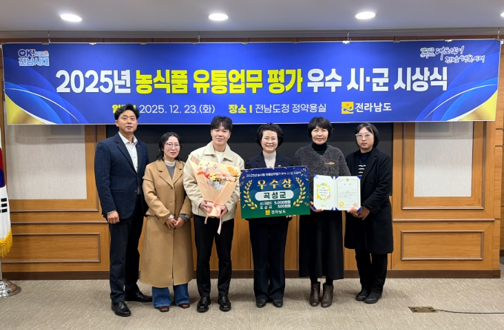 [시사토픽뉴스] 곡성군수는 전라남도가 주관한 ‘2025년 농식품 유통업무 우수 시‧군 평가’에서‘우수상’을 수상했다고 23일 밝혔다. 군은 전년도에 동일 평가에서 ‘최우수상’을 받은 경력이 있으며, 이번 수상으로 농식품 유통업무 우수 지자체로서의 입지를 다졌다.