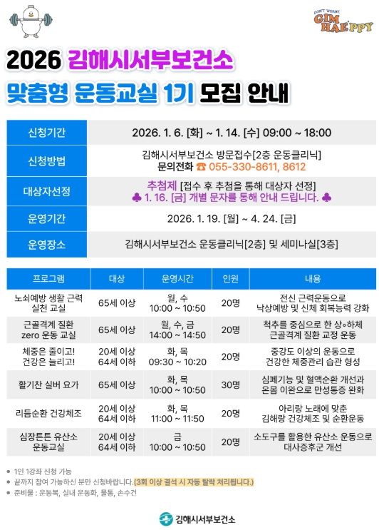 [시사토픽뉴스] 김해시서부보건소에서 1월 6일부터 14일까지 『2026년 맞춤형 운동교실 1기』 신규 참여자를 모집한다.