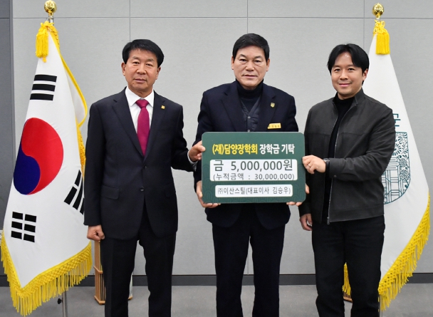 [시사토픽뉴스] (재)담양장학회는 지난 26일 ㈜이산스틸(대표이사 김승우)에서 5백만 원을, ㈜고서삼화자원(대표 이형수)에서 2백만 원을 기탁했다고 밝혔다.