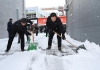 김산 군수와 공무원들이 무안읍 시가지에서 제설 작업을 하고 있다