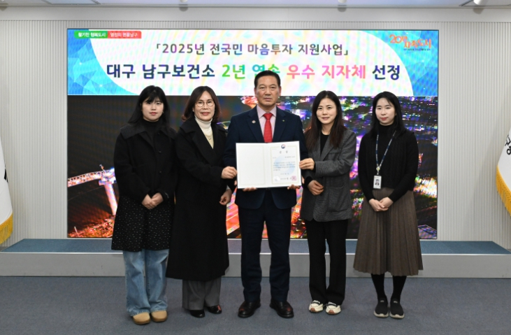 [시사토픽뉴스]대구 남구가 보건복지부가 주관한 ‘2025년 전국민 마음투자 지원사업 유공자 및 우수지자체 포상’에서 2년 연속 우수상을 수상했다.