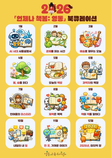 [시사토픽뉴스]영동교육도서관은 2026년 1월부터 12월까지 '언제나 책봄: 영동' 북큐레이션을 운영한다. 매월 주제에 맞는 대상별 추천도서 32권을 전시하여 도서관 이용자에게 다양한 독서 경험을 제공하기 위함이다.
