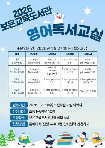 2026년 겨울 독서 교실은 보은교육도서관 홈페이지를 통해 신청할 수 있으며, 자세한 사항은 도서관으로 문의하면 된다.
