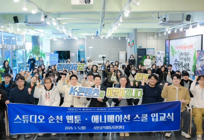 [시사토픽뉴스]순천시는 지난 5일 시민공익활동지원센터에서 ‘스튜디오 순천(Studio Suncheon)’ 웹툰, 애니메이션 스쿨 입교식을 개최하고, 지역기반 문화콘텐츠 핵심인재 양성을 위한 본격적인 교육을 시작했다고 밝혔다.