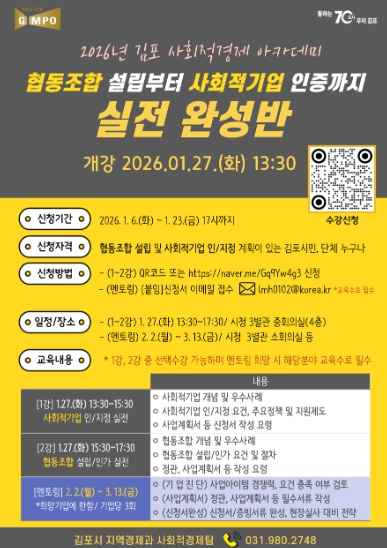 [시사토픽뉴스]김포시가 사회문제 해결을 위한 참신한 아이디어와 실행력을 갖춘 사회적경제기업 육성을 위해 '2026년 김포시 사회적경제 아카데미'를 개설하고, 오는 1월 23일까지 수강생을 모집한다.