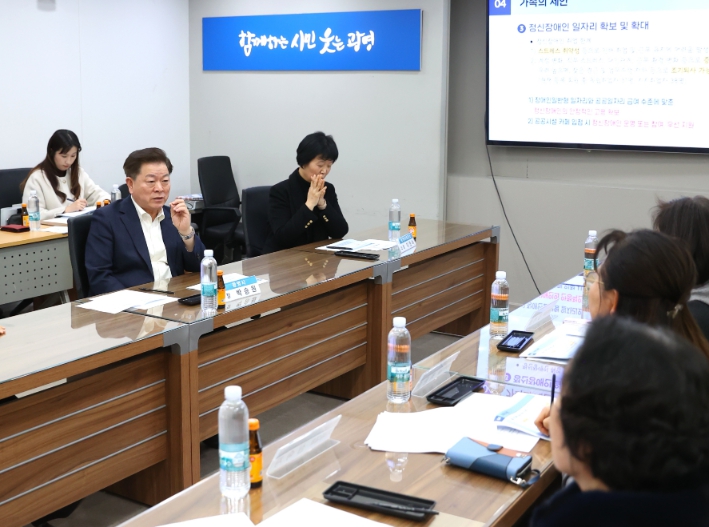 박승원 광명시장이 지난 6일 시청 영상회의실에서 열린 중증정신질환자 가족 대표와의 간담회에 참석해 가족들의 건의사항을 경청하고 있다.