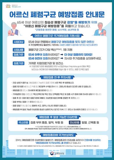 65세 이상 폐렴구균 예방접종 사업은 침습성 폐렴구균 감염증을 예방하기 위해 ‘폐렴구균 23가 다당백신(PPSV23)’을 평생 1회 무료 접종을 지원한다.