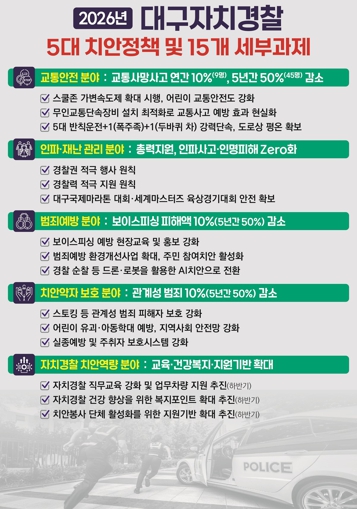 [시사토픽뉴스]대구자치경찰위원회는 2026년을 ‘시민과 함께 만드는 일상안전의 해’로 정하고, 교통안전·인파·범죄예방·치안약자 보호·치안역량 강화 등 5대 정책 분야 및 15개 세부 과제를 추진해 나갈 계획이다.