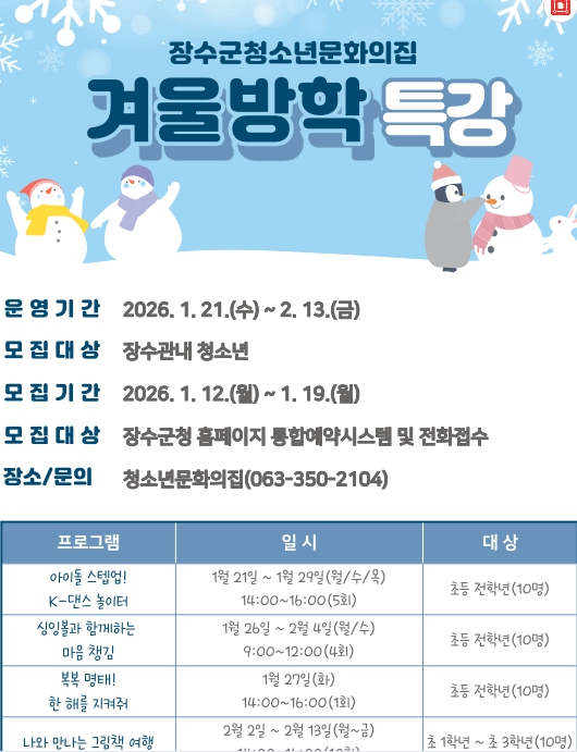[시사토픽뉴스]장수군은 오는 21일부터 다음달 13일까지 지역 청소년들을 대상으로 방학 기간을 보다 의미 있게 보낼 수 있도록 장수군청소년문화의집에서 다양한 겨울방학 특강 프로그램을 운영한다.