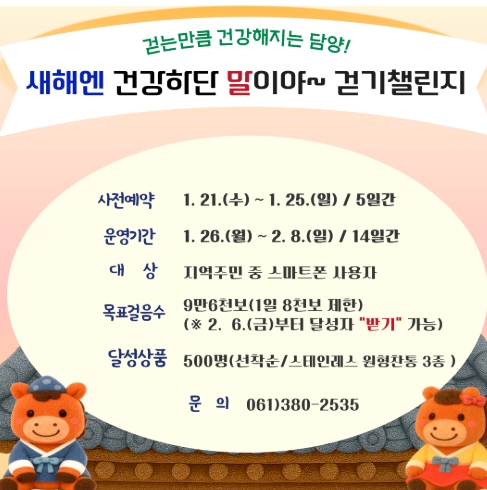 [시사토픽뉴스]담양군은 2026년 새해를 맞아 오는 1월 26일부터 2월 8일까지 온라인 걷기 챌린지 ‘새해엔 건강하단 말이야’를 운영한다고 밝혔다.