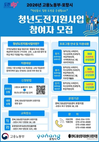 2026년 고용노동부 포항시 청년도전지원사업 홍보 이미지.