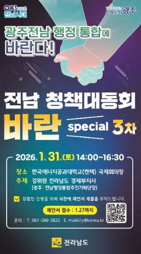 전남도는 이번 행사에서 제시된 의견을 소관 부서 검토를 거쳐 광주·전남 통합특별법과 도정 전반에 적극 반영할 방침이다.